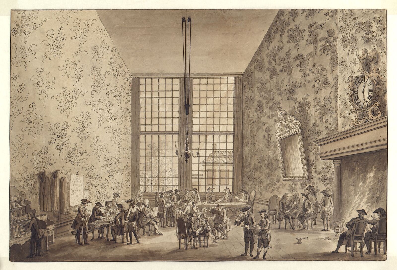 Op deze tekening van Isaac Lodewijk la Fargue van Nieuwland uit 1761 is het interieur van het Franse Koffiehuis te zien. Dit koffiehuis bevond zich aan de Kalverstraat 23–25. In de afgebeelde zaal is een grote menigte bezoekers te zien. Onder het genot van het haardvuur, rechts in beeld, houden zij zich bezig met dammen, lezen, drinken en praten.