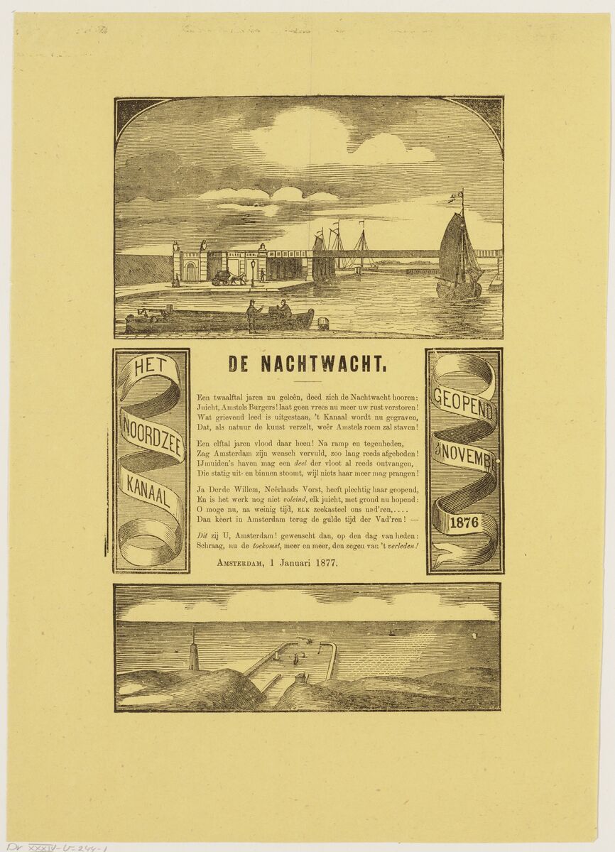 Het gedicht bejubeld de aanleg van het kanaal "dat, als de natuur de kunst verzelt, weer Amstels roem zal staven!" Daarnaast bevat de afbeelding twee prenten: de bovenste toont de westelijke toegang van het kanaal, terwijl de onderste de monding van het Noordzeekanaal bij IJmuiden weergeeft.