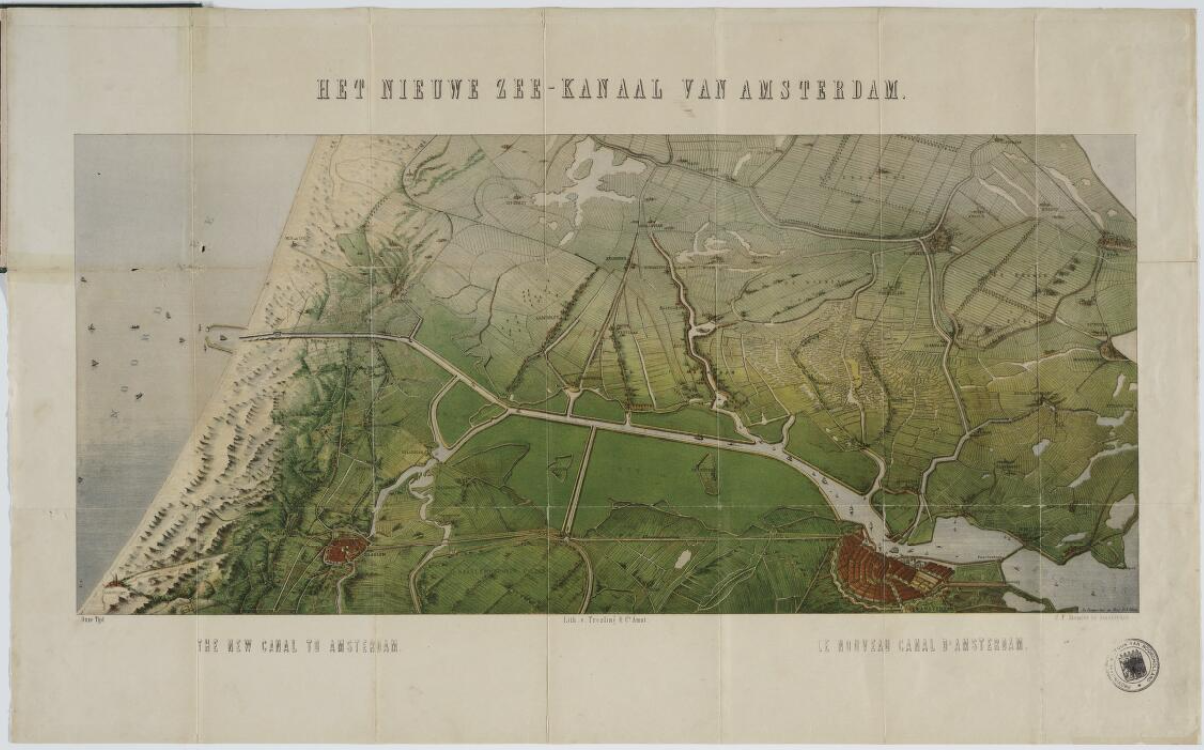 Op de tweede afbeelding zie je een kaart met het gebied van het Noordzeekanaal. De kaart is gemaakt door P.J. Otten in 1866 en wordt bewaard in het Noord-Hollands Archief.