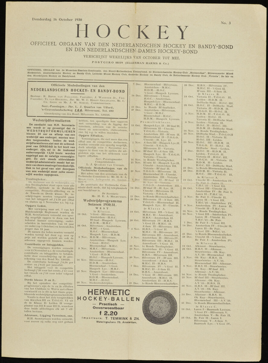 Deze pagina komt uit het weekblad Hockey Sport uit oktober 1930, afkomstig uit het archief van de Amsterdamsche Hockey en Bandy Club. Het blad bevat wedstrijdprogramma’s, uitslagen en andere informatie over hockey in Amsterdam en laat zien hoe georganiseerd de sport begin twintigste eeuw al was.