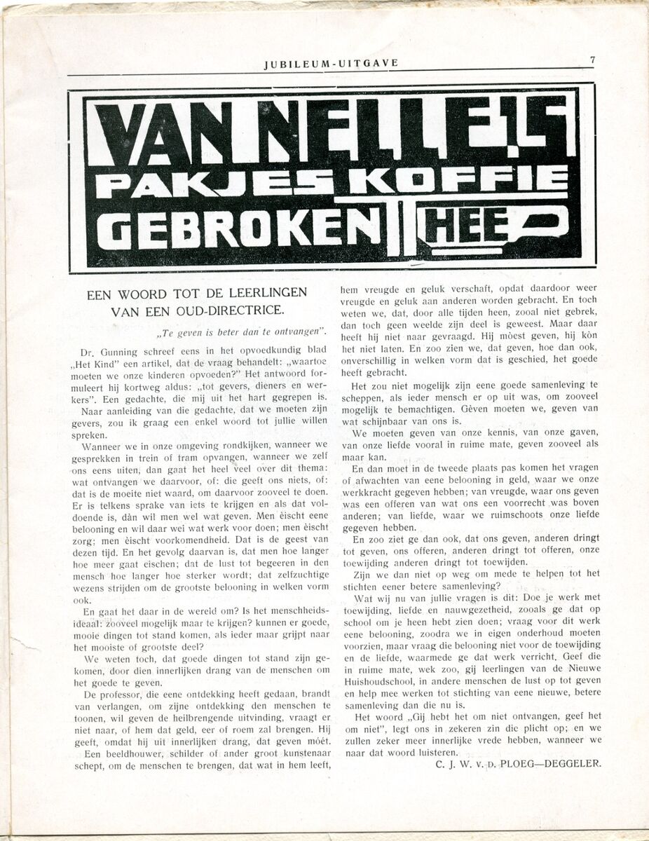 In 1929 bestaat De Nieuwe Huishoudschool in Amsterdam 25 jaar. Voor dit feest schrijft oud-directrice C.J.W. van der Ploeg-Deggeller een boodschap aan de leerlingen in een speciaal boekje.